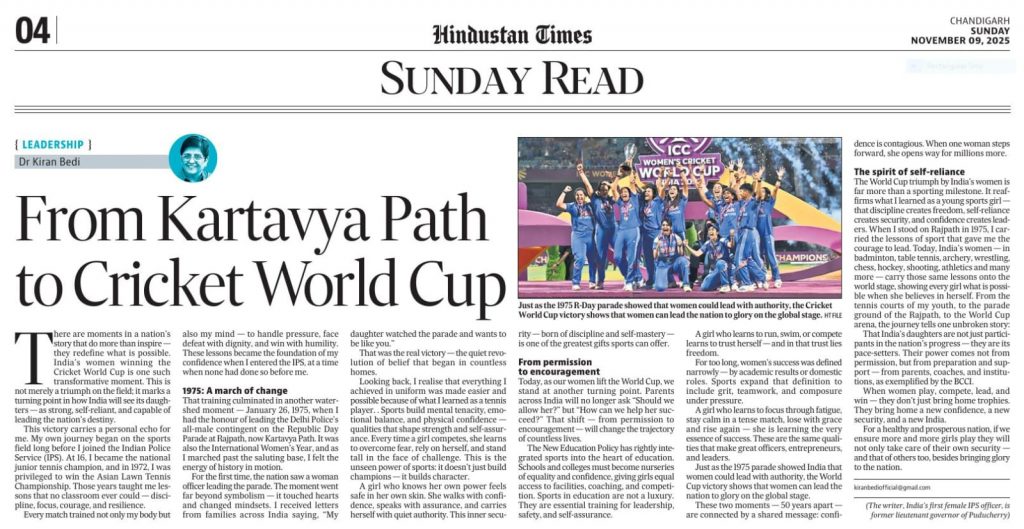 The World Cup triumph by India’s women is far more than a sporting milestone. It reaffirms what I learned as a young sports girl — that discipline creates freedom, self-reliance creates security, and confidence creates leaders.