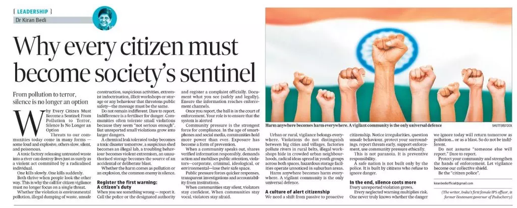 We need a shift from passive to proactive citizenship. Notice irregularities, question unsafe behaviour, protect your surroundings, report threats early, support enforcement, use community pressure ethically.